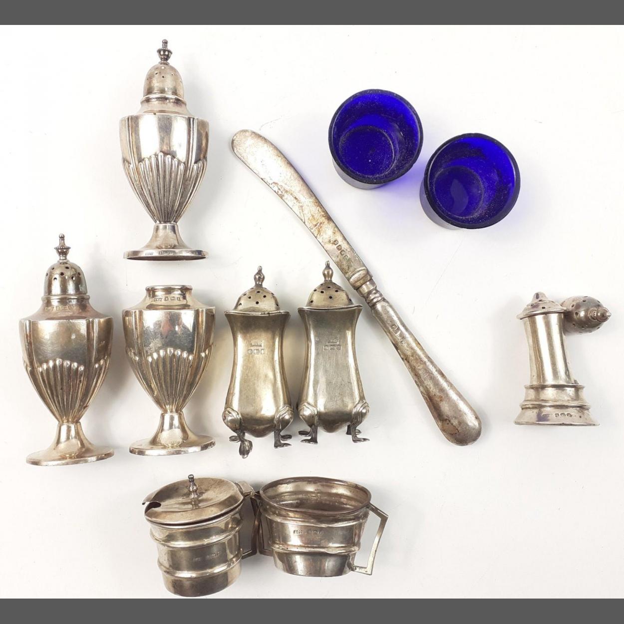 A small selection of silver hallmarked cruet sets to include Sheffield and Birmingham hallmarks. Gross weight 200g approx, excluding liners and knife. All pieces with wear.