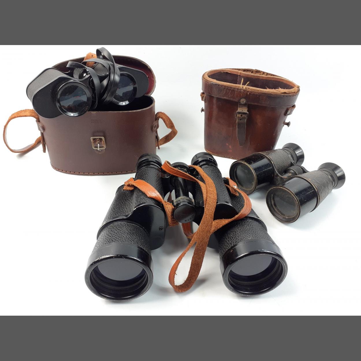 Three sets of binoculars to include TOHYOH 12-50 requiring cleaning - condition good lenses, one older pair in poor condition