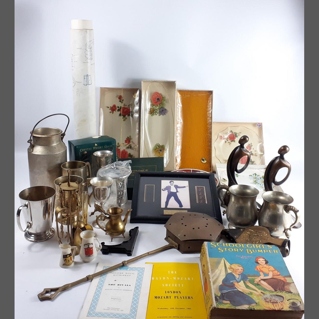 A mixed lot to include 2 art posters in a tube, a small aluminium milk churn, 2 bronze effect statuettes, some brass and copper wear, an Elvis picture, a Charles Rennie Mackintosh style frame in a box, various tankards, decorative plates, 2 pieces of local interest - crested pottery marked for Hawick and St Boswells etc