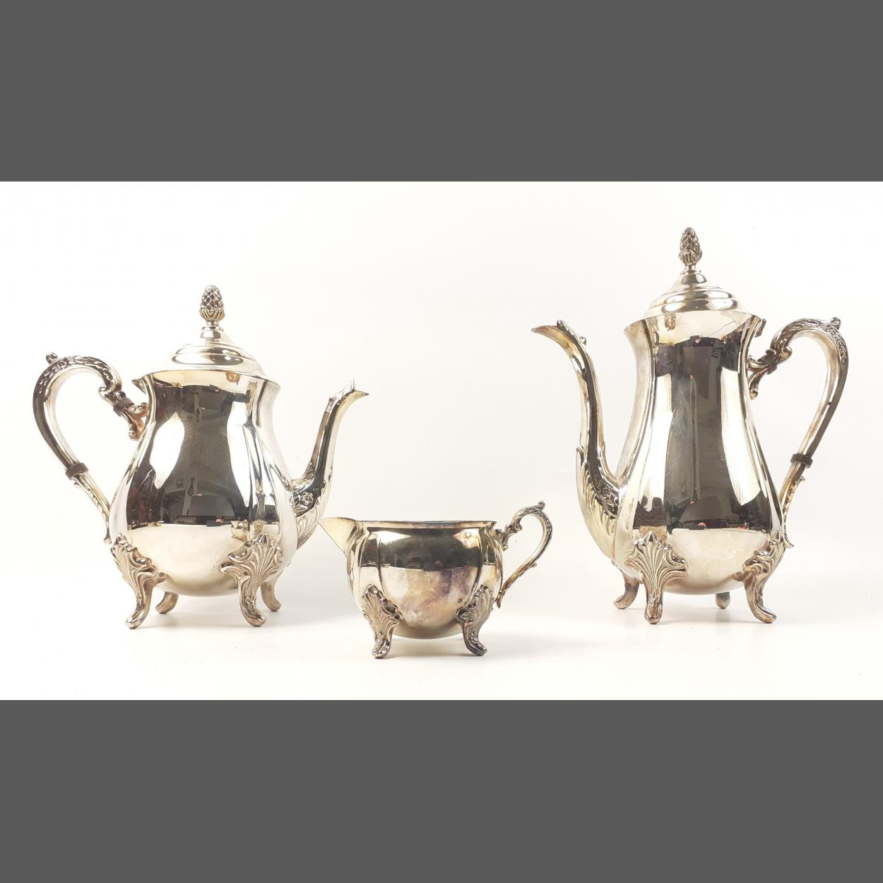 An attractive 3 piece VINER'S coffee service with pineapple finials comprising coffee pot (28cm high), water jug and creamer. Coffee pot lid needs to be re-soldered
