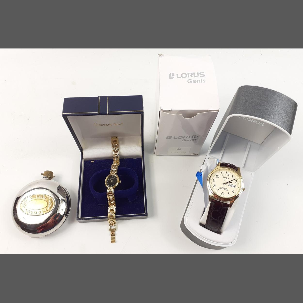 A small collection of timepieces to include an unused gent's LORUS lumibrite water resistant watch with black leather strap in presentation box with guarantee, a boxed ladies SEKONDA cocktail watch and a DALVEY voyager clock