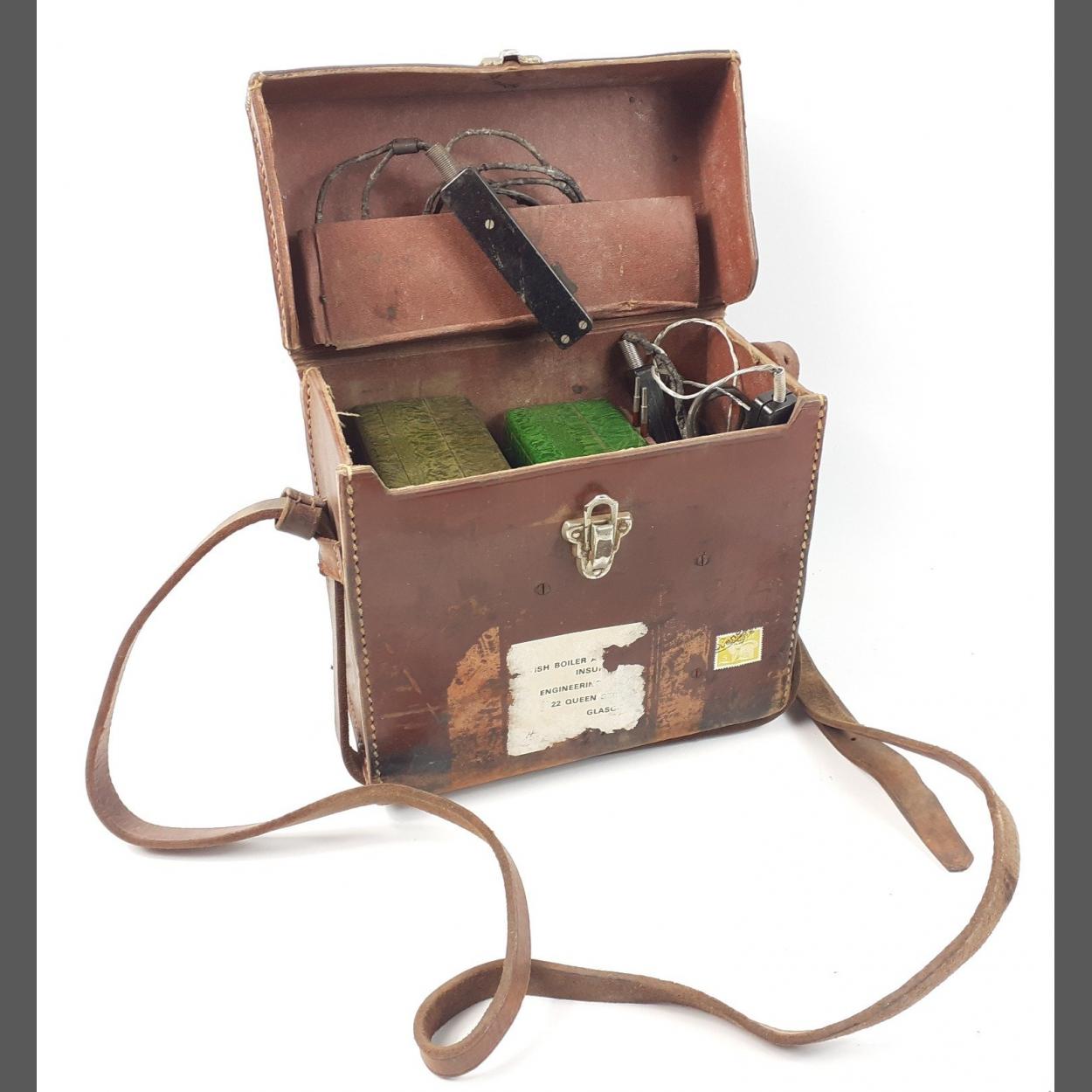 An engineer's testing kit with 2 ohms metres in fitted leather case with a partial label - Scottish Boiler ? Insurance Engineering