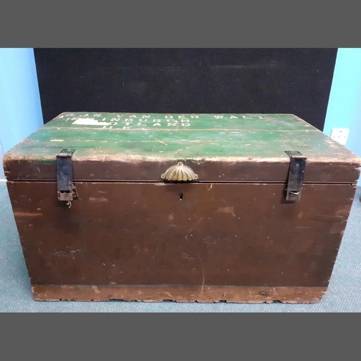 A pine travelling trunk with green painted lid, W92xH50xD50cm approx, with original working clasps and original brass clamshell handle and various shipping labels, named to AJS van der Walk Edinburgh, Scotland, UK. Vendor's relative travelled to South Africa in the early 20th century,