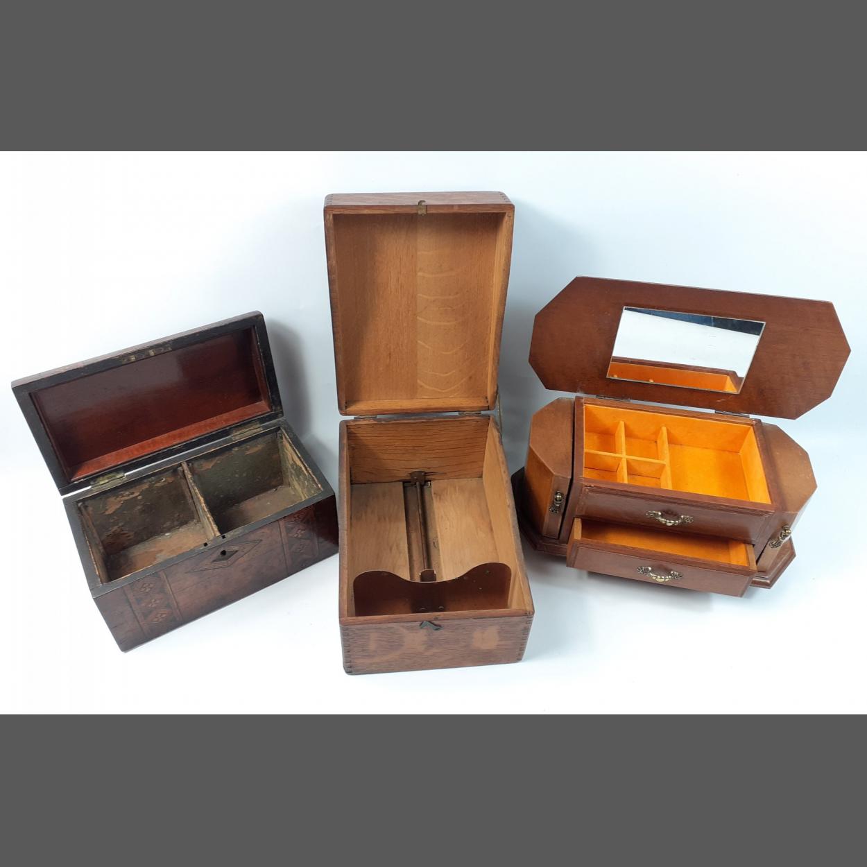 Three wooden boxes including an inlaid tea caddy (would look beautiful with some TLC), a Shaw Walker filing box and a more modern jewellery box
