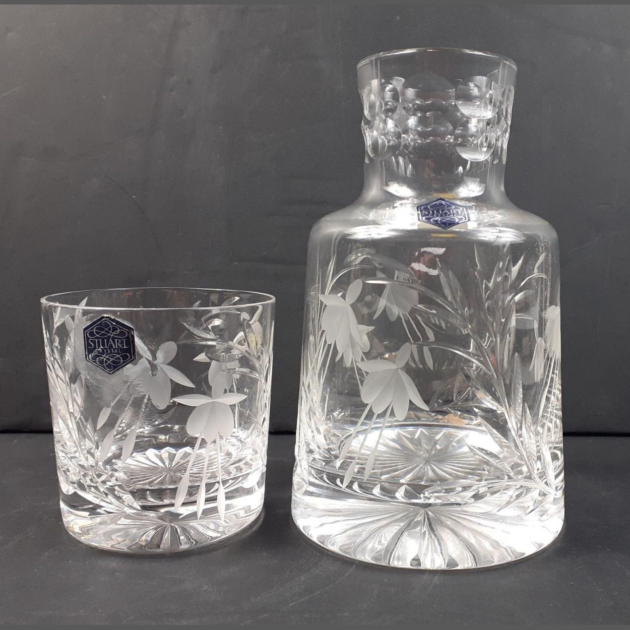 A first quality STUART crystal water carafe and glass with fuschia motifs, with labels