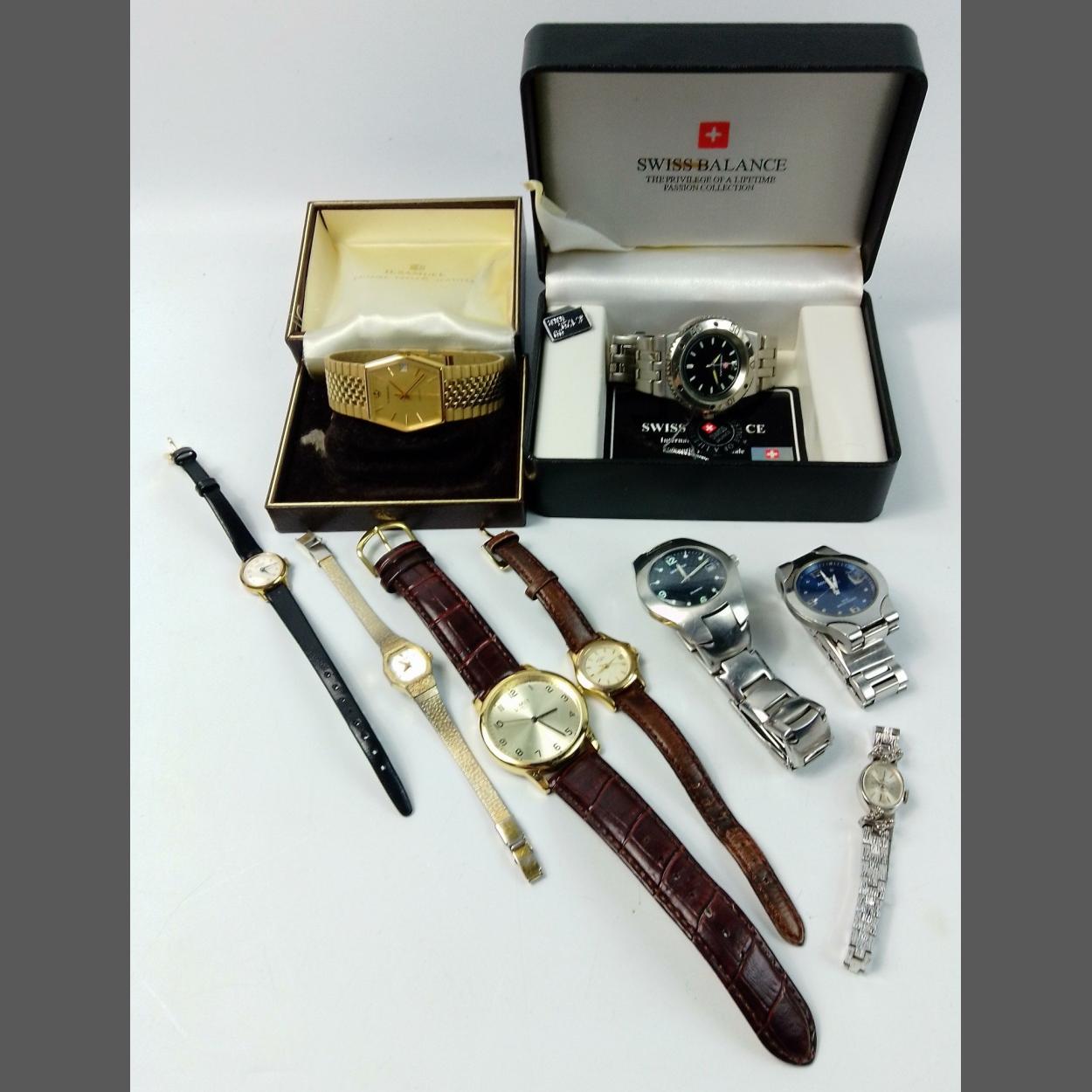 A selection of quality gent's dress wrist watches to include a rather lovely H SAMUEL hexagon quartz wristwatch in AF box, a boxed SWISS BALANCE quartz watch, an ACCURIST wrist watch MB479N and a SEKONDA 50m water resistant watch model 04039 and others. Batteries needed.