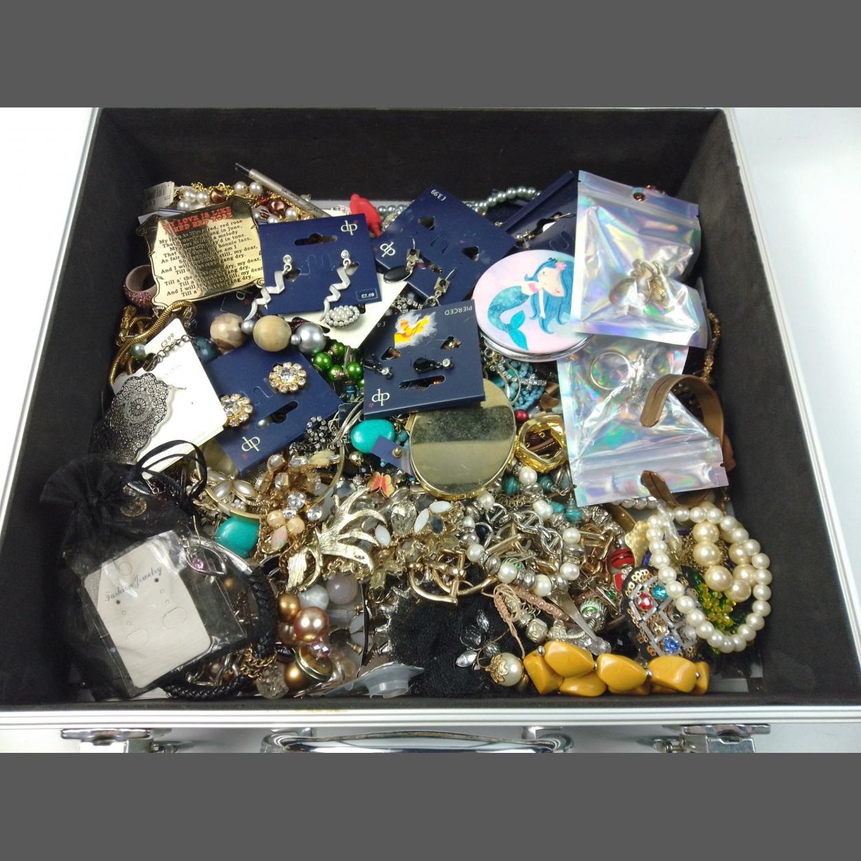 A super twin sided jewellery display suitcase full of interesting costume jewellery to include compacts, beads, necklaces, earrings, and much else of interest