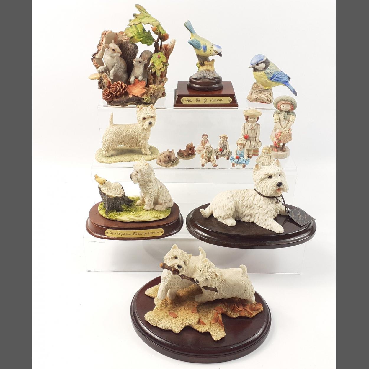A small collection of decorative pieces to include an Italian terrier, a Sheraton Simpson terrier duo, a Border Fine Arts terrier, 2 bluetits, and other small items. Lot includes a Country Artists Natural World which has damage