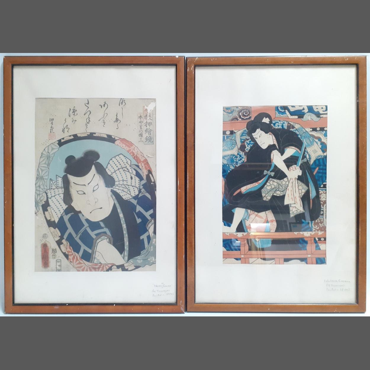A pair of RARE Japanese woodblock prints by two artists Ishukawa Goemon 21cm x 32cm and Koyarino Gonzo 24cm x 34cm by Toyokuni painted in 1850's subject depicting ferocious Japanese Lords in traditional dress