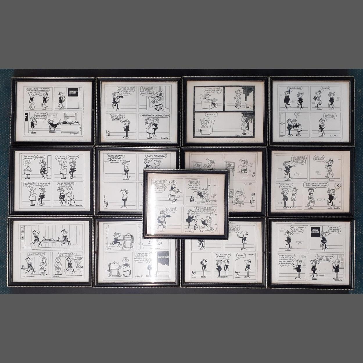 A box of thirteen ANDY CAPP cartoons set in older frames each measuring 27x23cm approx.
