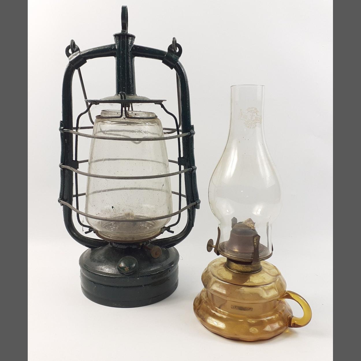 A vintage, overpainted, oil storm lamp, intact glass embossed 'British Manufacture' and a small oil lamp with glass chimney