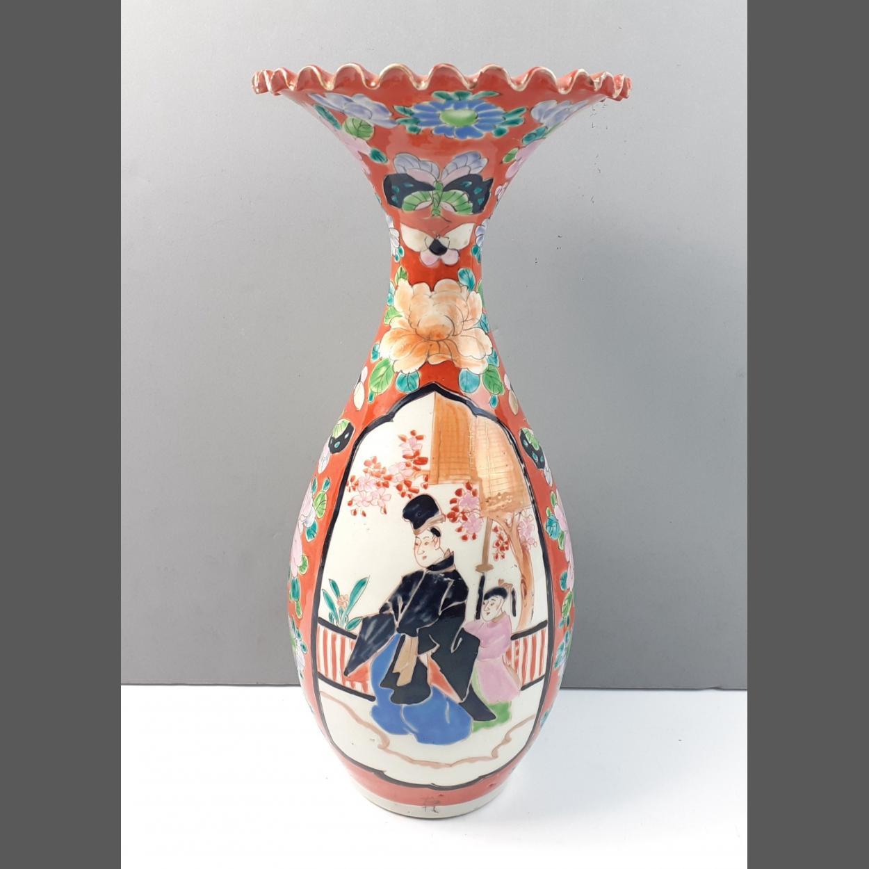 A trumpet shape, JAPANESE IMARI style vase with a decorative scalloped edge top. Four panels, hand painted in enamel on an authentic base colour of iron red with gilt highlights. Two show 2 figures: a man standing in traditional dress and one behind. The background is a garden with trees and cherry blossom. The other two are of colourful butterflies and chrysanthemums in shades of blue, pinks and orange. Stands approx 30cm with no damage