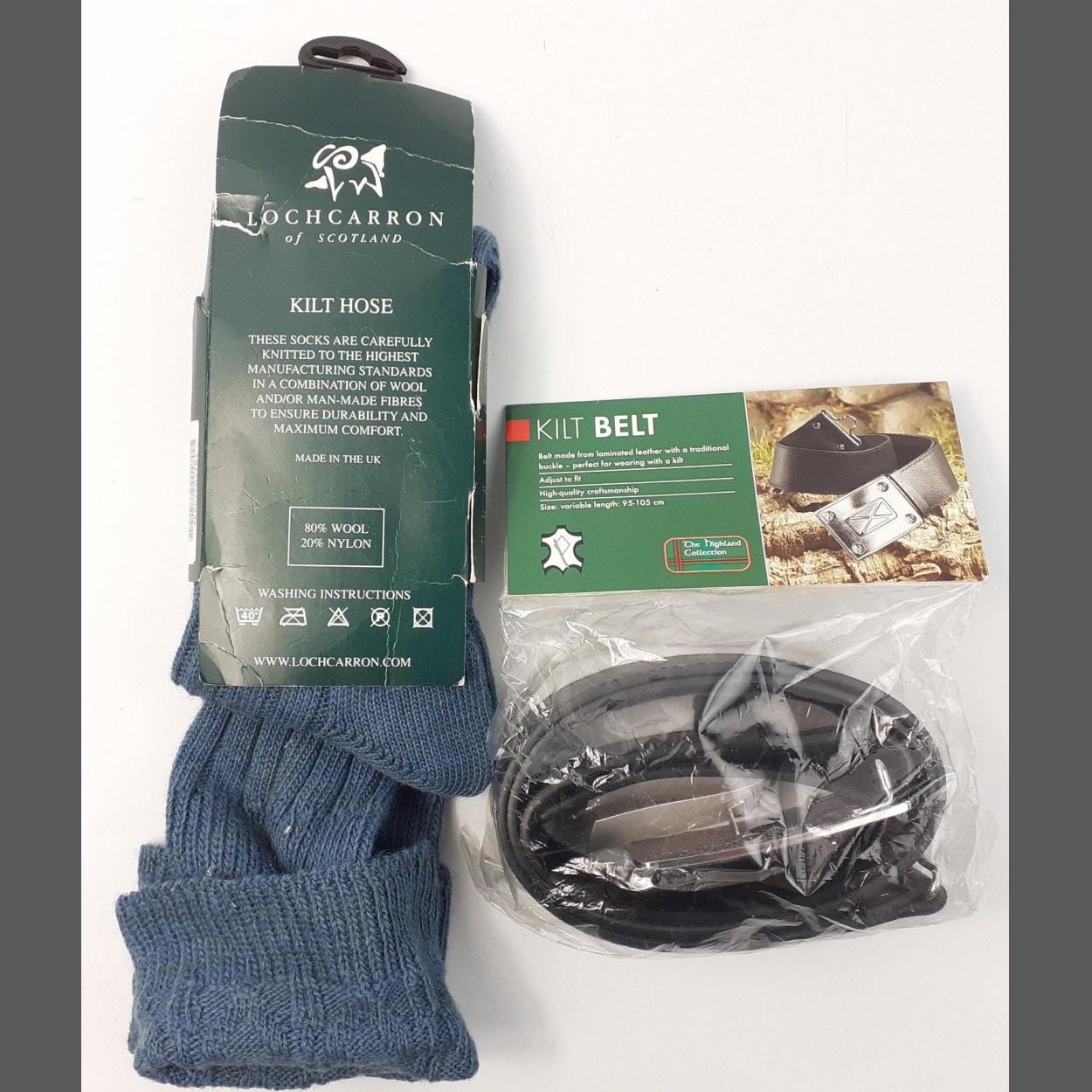 A new kilt belt and buckle in unopened pack, size 95-105cm, plus a pair of new size 8 lovat blue kilt hose by LOCH CARRON