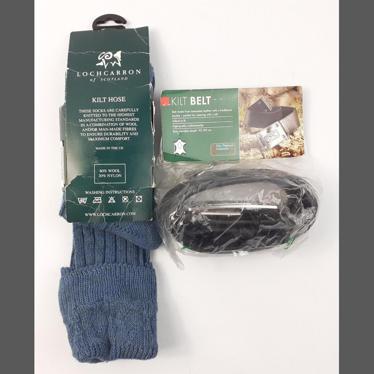 A new kilt belt and buckle in unopened pack, size 95-105cm, plus a pair of new size 8 lovat blue kilt hose by LOCH CARRON