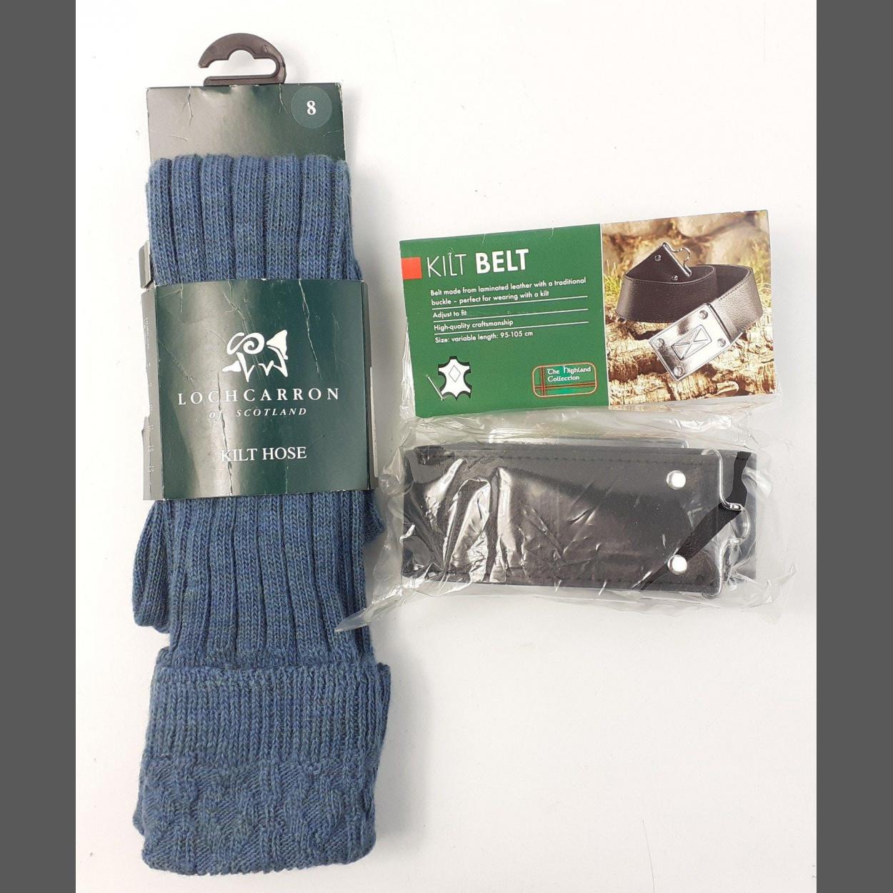 A new kilt belt and buckle in unopened pack, size 95-105cm, plus a pair of new size 8 lovat blue kilt hose by LOCH CARRON