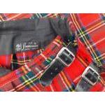 A pure new wool ROYAL STEWART kilt made by STRATHMORE, waist 32-34", length 24", with double buckle. Small hole where kilt pin has been.