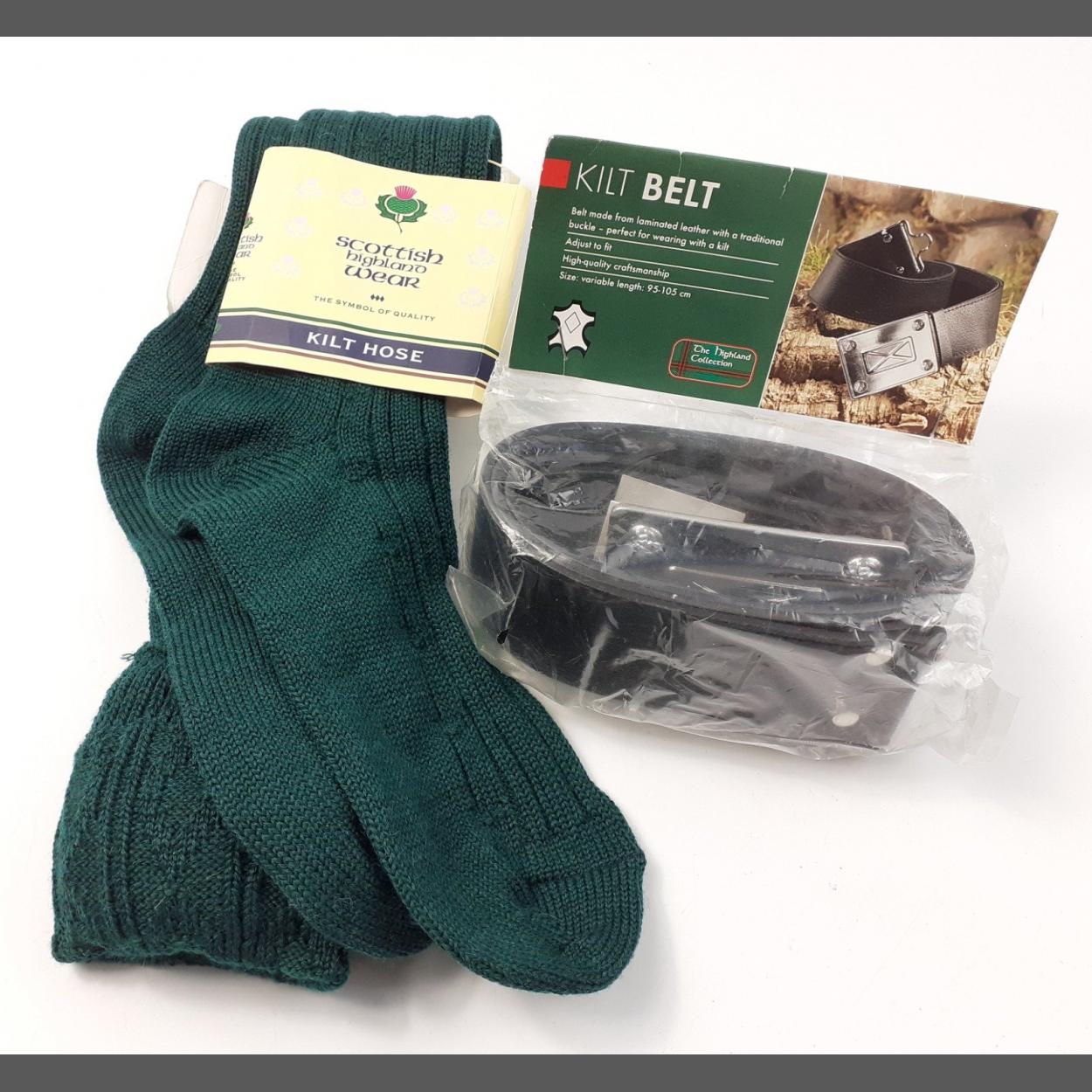 A new kilt belt and buckle in unopened pack, size 95-105cm, plus a pair of new size 9-13 green kilt hose by SCOTTISH HIGHLAND WEAR