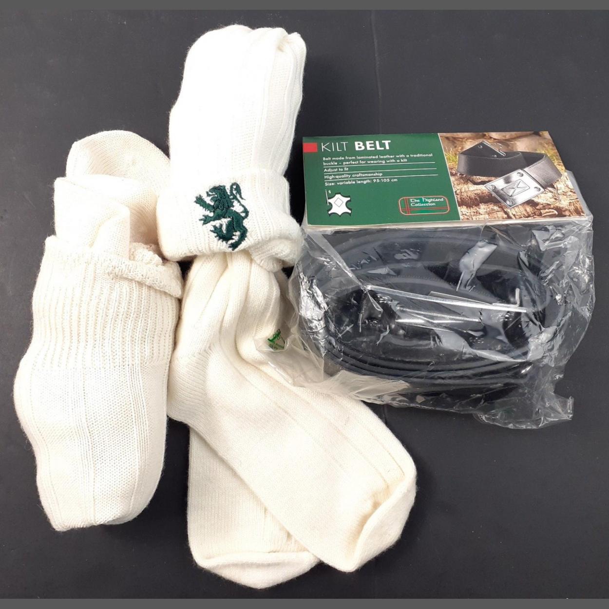 A new kilt belt and buckle in unopened pack, size 95-105cm, plus 2 pairs of new kilt hose with dragon motifs