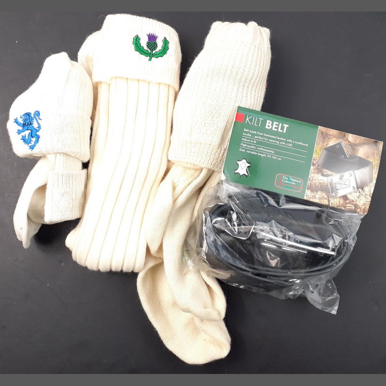 A new kilt belt and buckle in unopened pack, size 95-105cm, plus 3 pairs of new adult ecru kilt hose by MR RITCHIE with thistle motif, blue lion rampant and one patterned