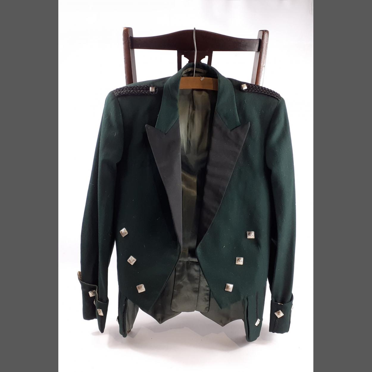 A gent's regulation doublet jacket in hunter green with black lapels and green satin lining, size 36" chest. In need of some repair