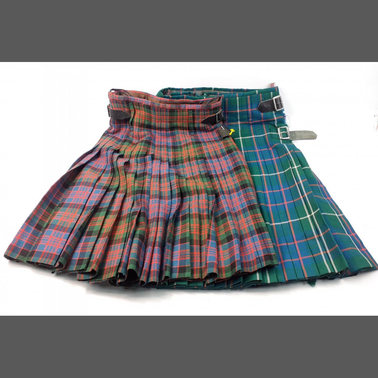 Two gent's kilts, with some damage, one 30-32" waist, 25" long, the other 30" waist, 26" length. Possibly INGLIS (green) and one other