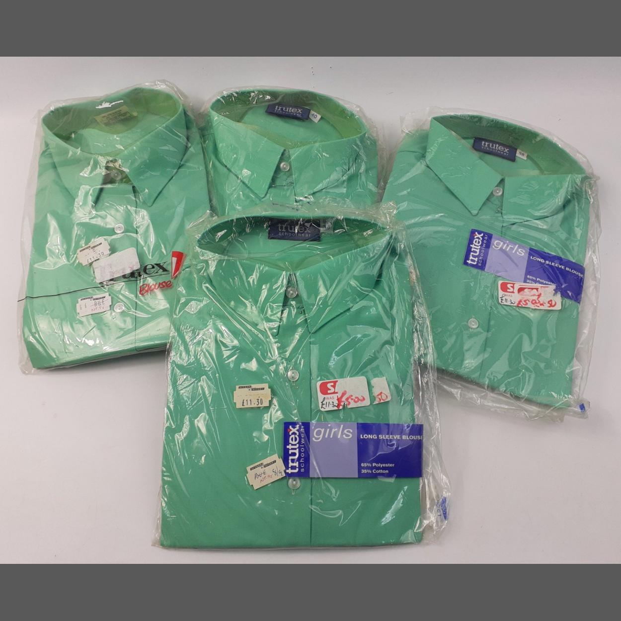 Three green unopened girl's long-sleeved school blouses size 38 and one size 40. Sold by AITKEN & NIVEN