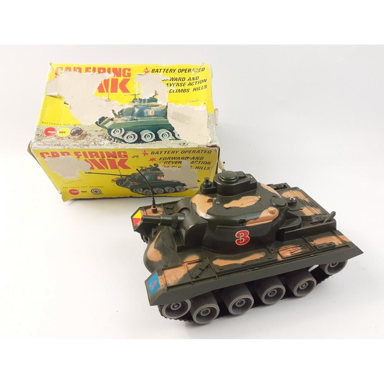 A vintage MARX TOYS plastic cap firing tank in worn box. Complete with detachable barrel and tracks. Externally excellent but internals have signs of use although battery terminals are clean. 20cm long excl. barrel