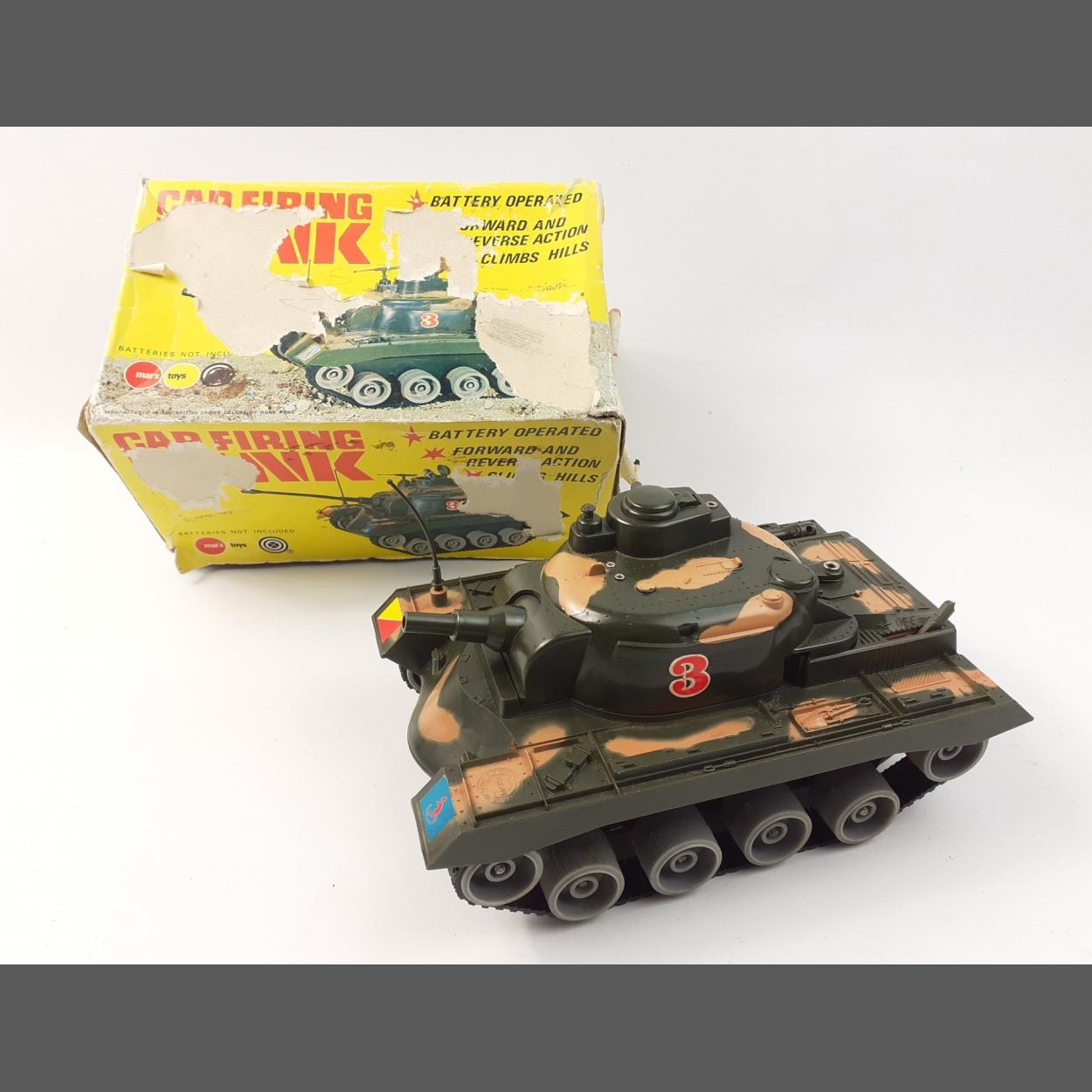 A vintage MARX TOYS plastic cap firing tank in worn box. Complete with detachable barrel and tracks. Externally excellent but internals have signs of use although battery terminals are clean. 20cm long excl. barrel