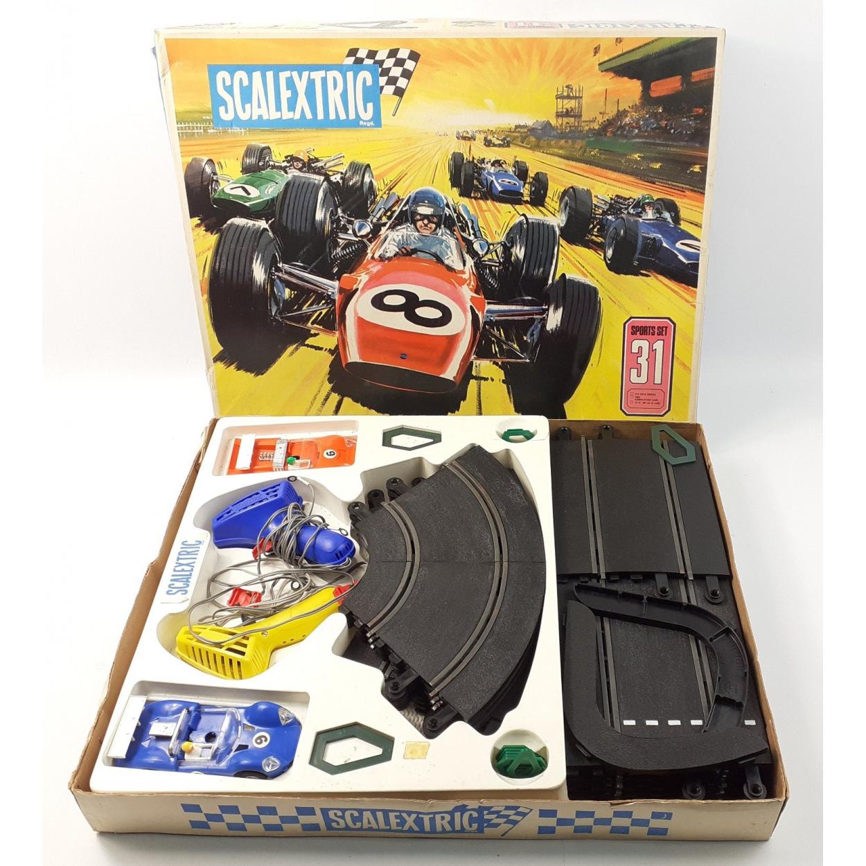 SCALEXTRIC Sports Set 31 in original box. Cars appear to be in good used condition. Track has light rust spotting in places. Nice nostalgic set.