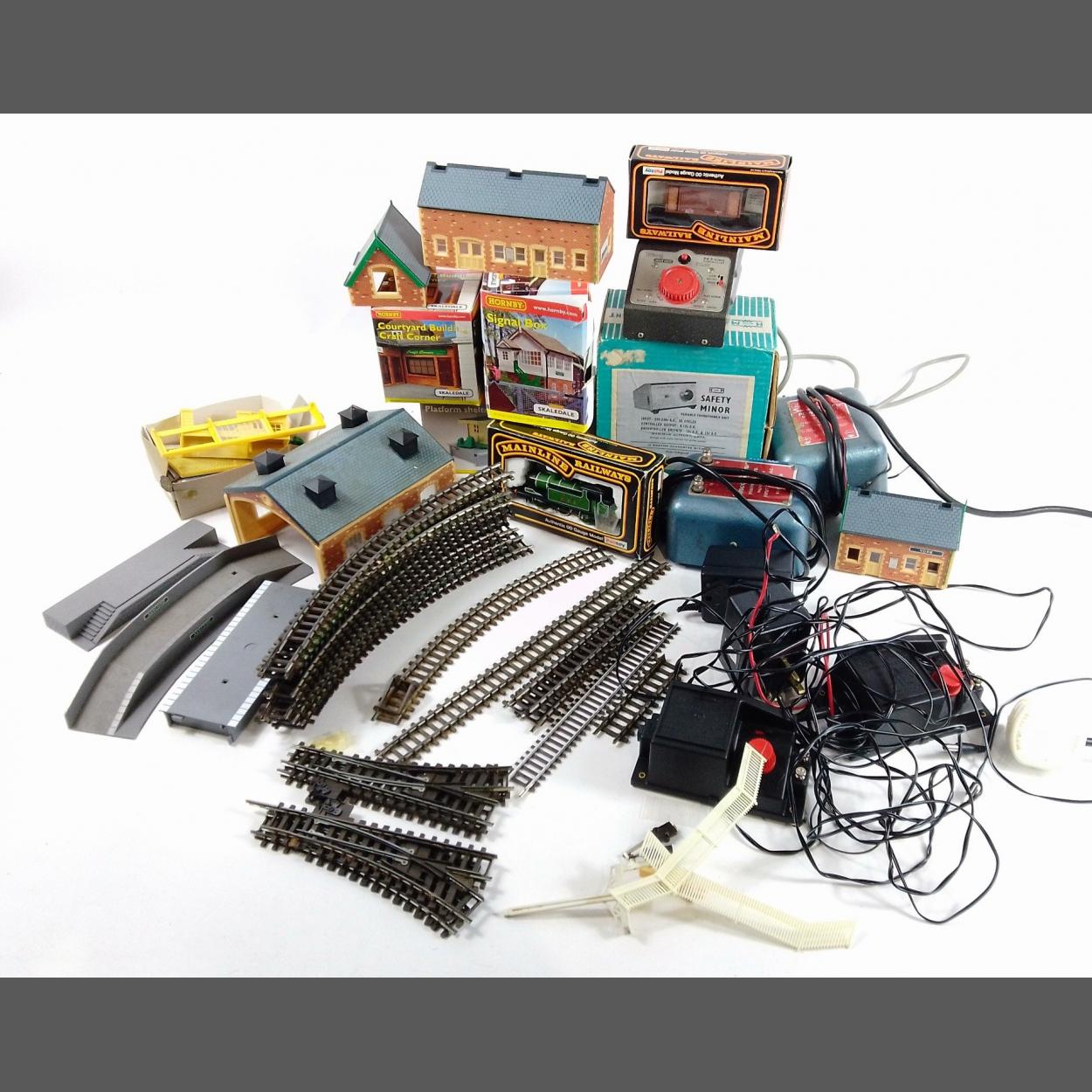 A great little lot of railway diorama layouts to include OO track, buildings and peripherals. Includes boxed transformer.