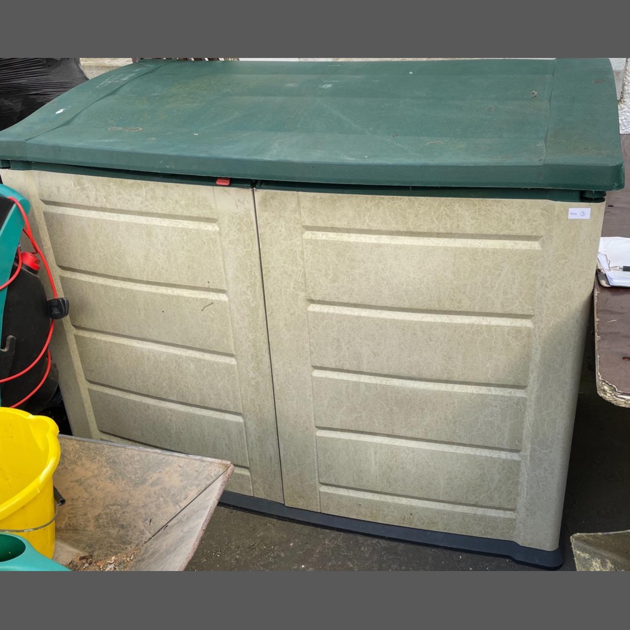 A ROBUST large garden low level plastic garden tool store 145cm length x 76cm depth with a lifting lid and two large doors height 110cm