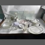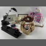 Mixed box to include a small DARTINGTON crystal vase standing 10cm tall, an unusual castle shaped plant holder etc.
