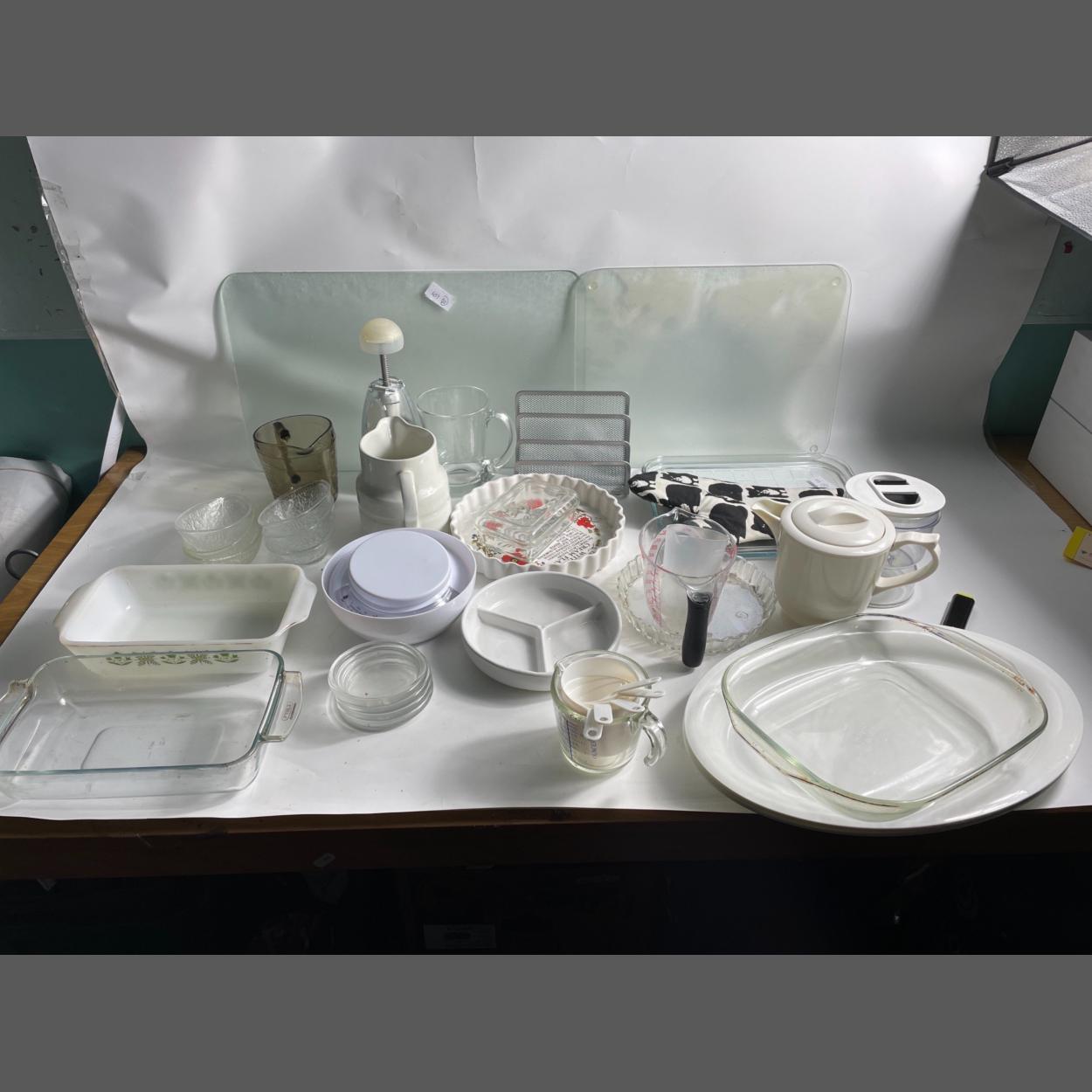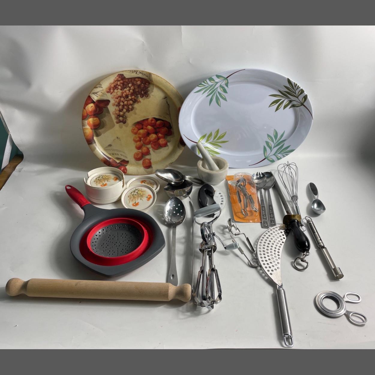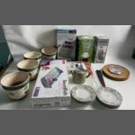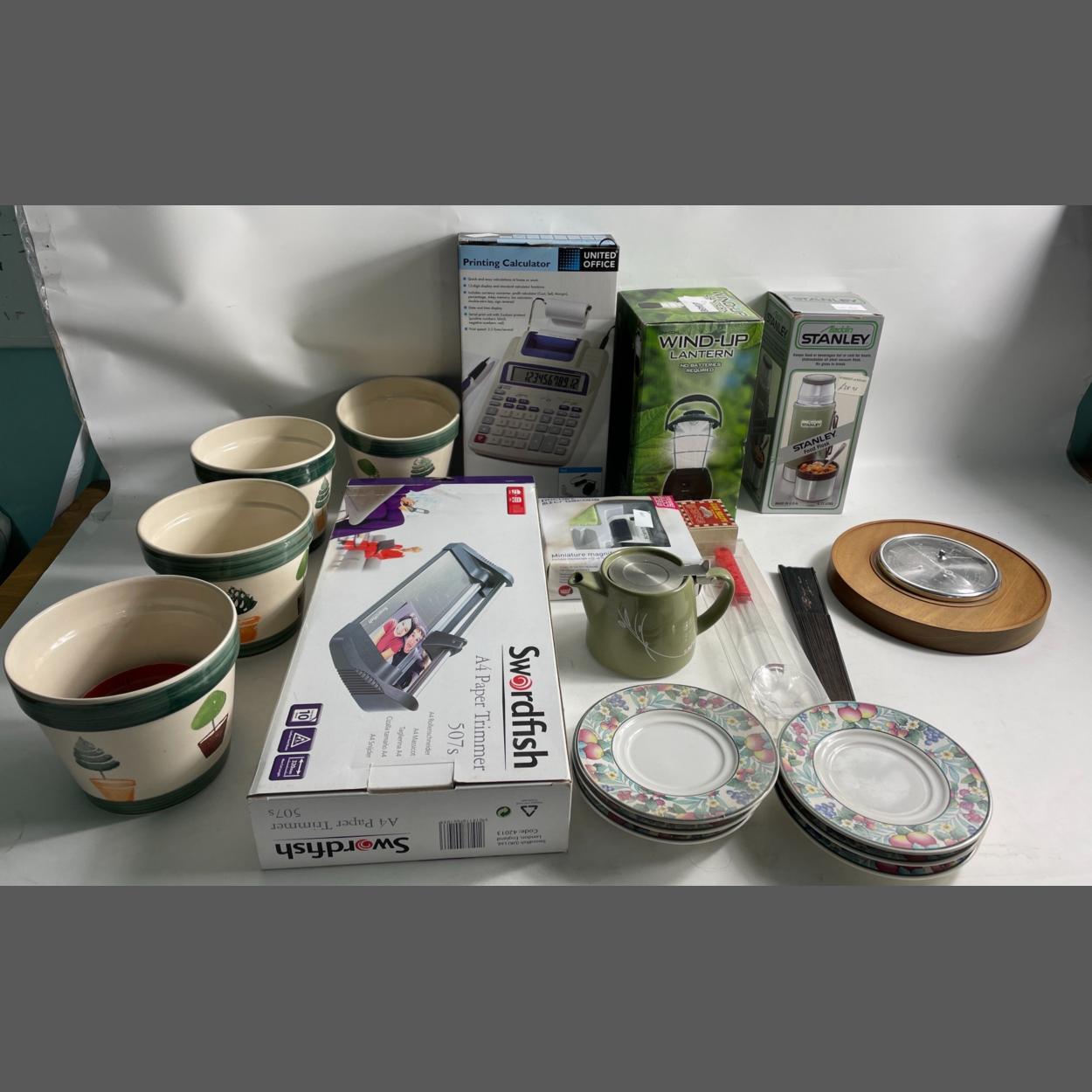 A mixed box of useful items including an ALADDIN STANLEY FOOD FLASK (.71l) cost £38.95 new, a paper trimmer, a printing calculator, 4 matching plant pots (14cm tall) etc.