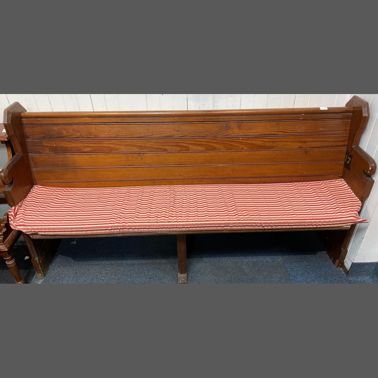 Vintage wooden CHURCH PEW complete with padded seat 175 x 95 cm approx.