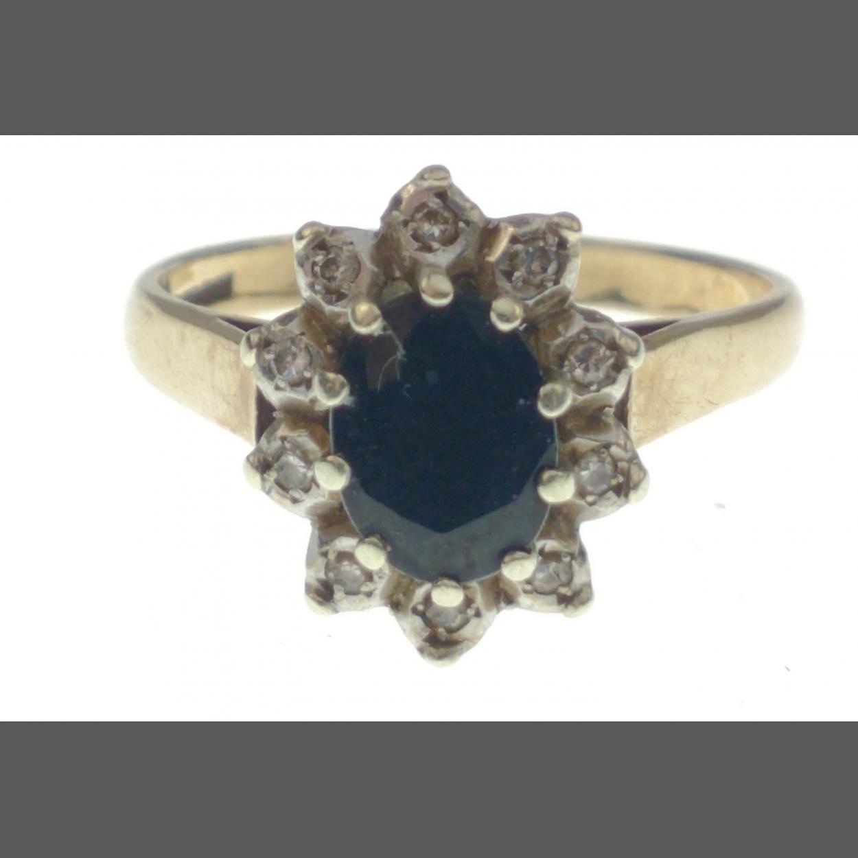 375 hallmarked ring with a blue stone and diamonds, 3.16g gross weight, Size P