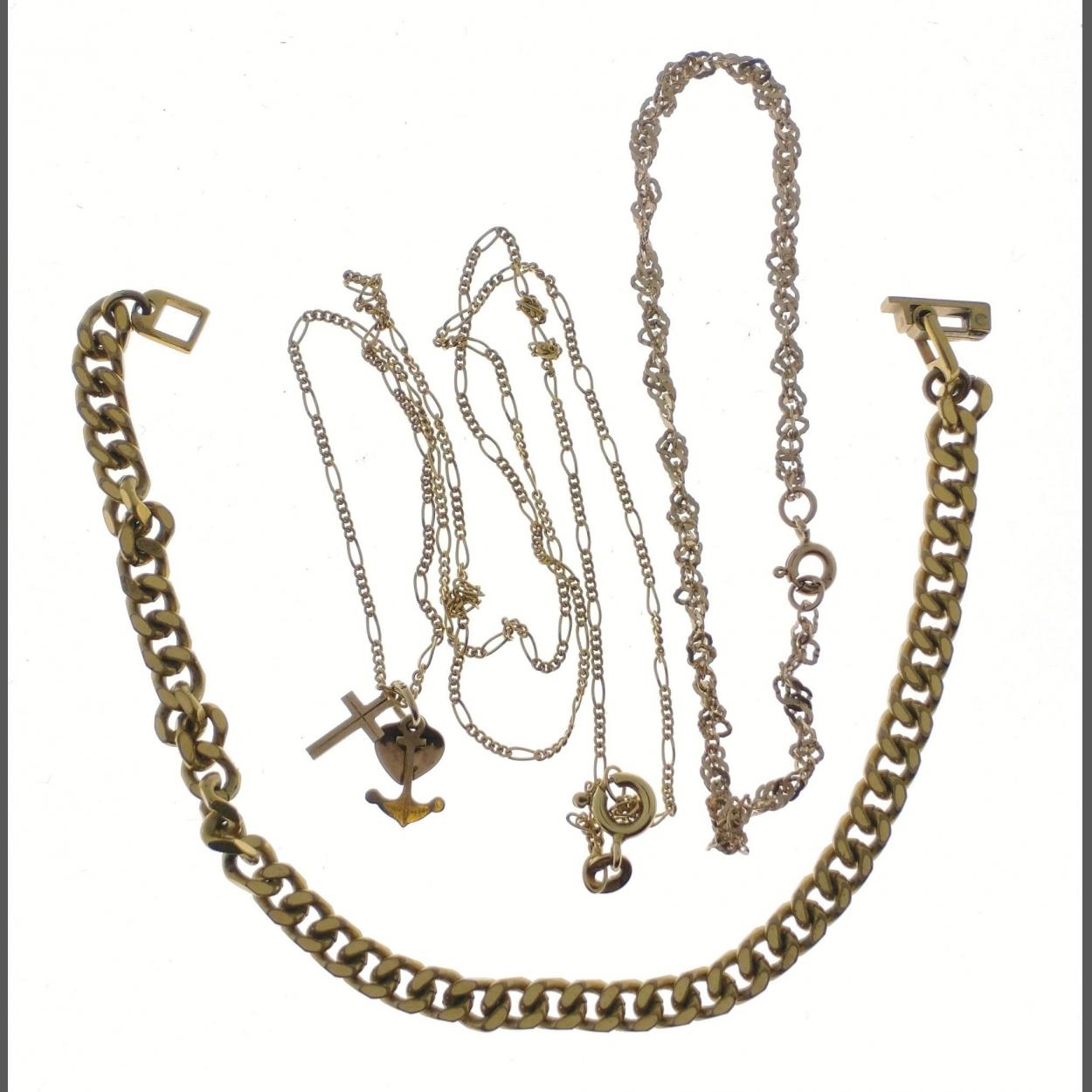 A 'yellow metal' chainlink bracelet (tested as 9ct) 9.58g, a nice necklace stamped 375 with a cross and an anchor attached, total weight 2.21g, and lastly a 375 stamped bracelet weight 1.38g