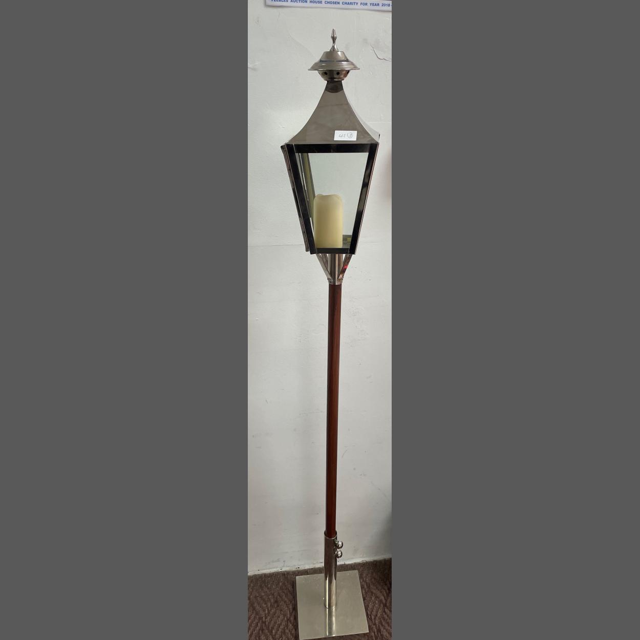 A rather nice GARDEN LANTERN in chrome including a candle with a spike for switching to softer ground 155cm and its chrome stand!