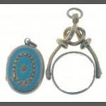 A Victorian 'yellow metal' fob charm with missing stone weight 5.29g approx, a VINTAGE 'yellow metal' photo pendant with blue enamel style and seed pearls inset weight gross 6.15g approx. Both acid test to 12ct