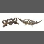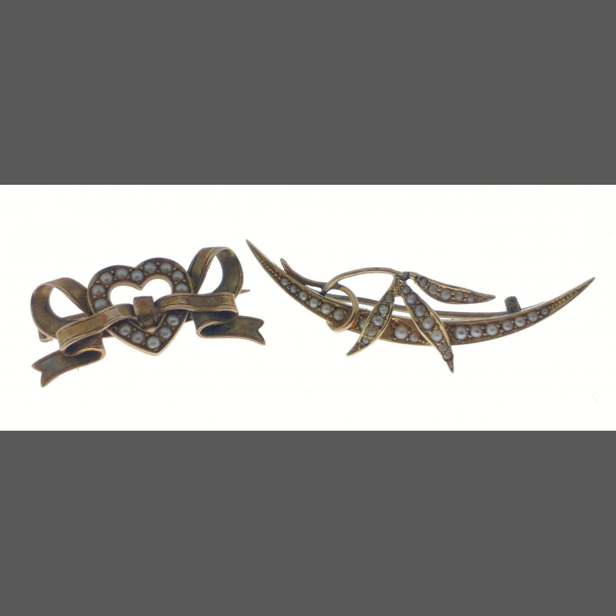 Two BEAUTIFUL VICTORIAN seed pearl inset 'yellow metal' brooches, one with a half crescent and flora design 5cm length weight gross 5.30g approx and the other a love heart surrounded with swirly ribbons weight 5.75g gross 3cm length (both test as 12ct)