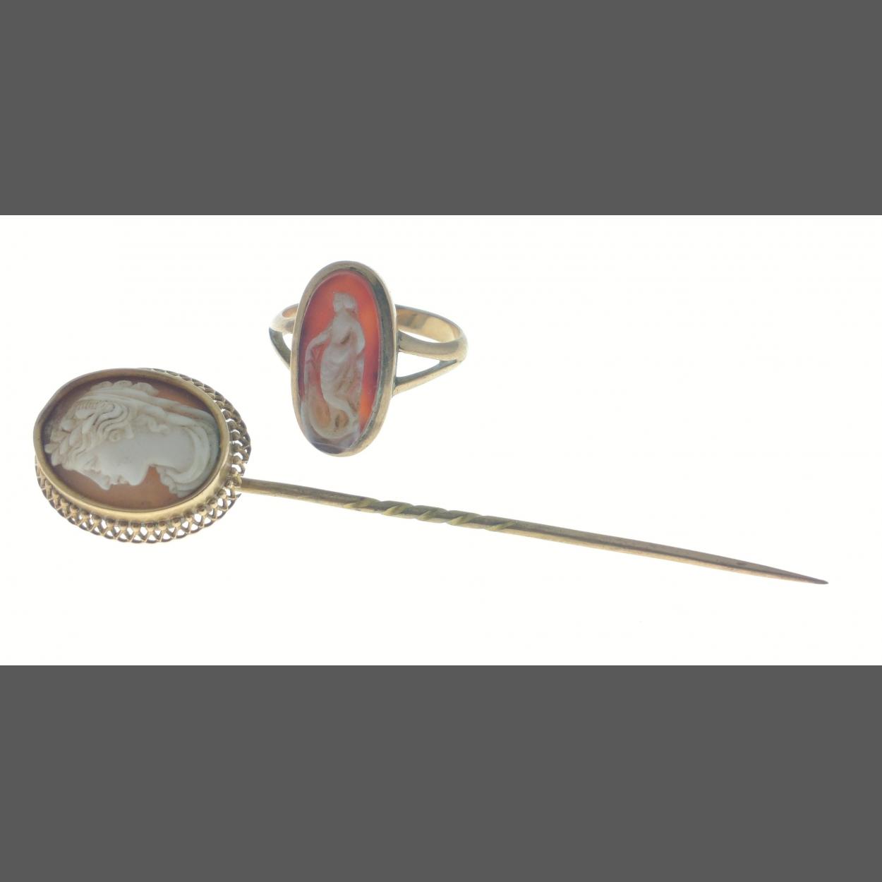 Vintage 'Yellow metal' ladies dress ring size O, mounted with an unusual brown/creamish stone, gross weight approx 3.20g (tests as 9ct), with also stamped 18c a large yellow VINTAGE gold ring size W weight 3.02g gross approx