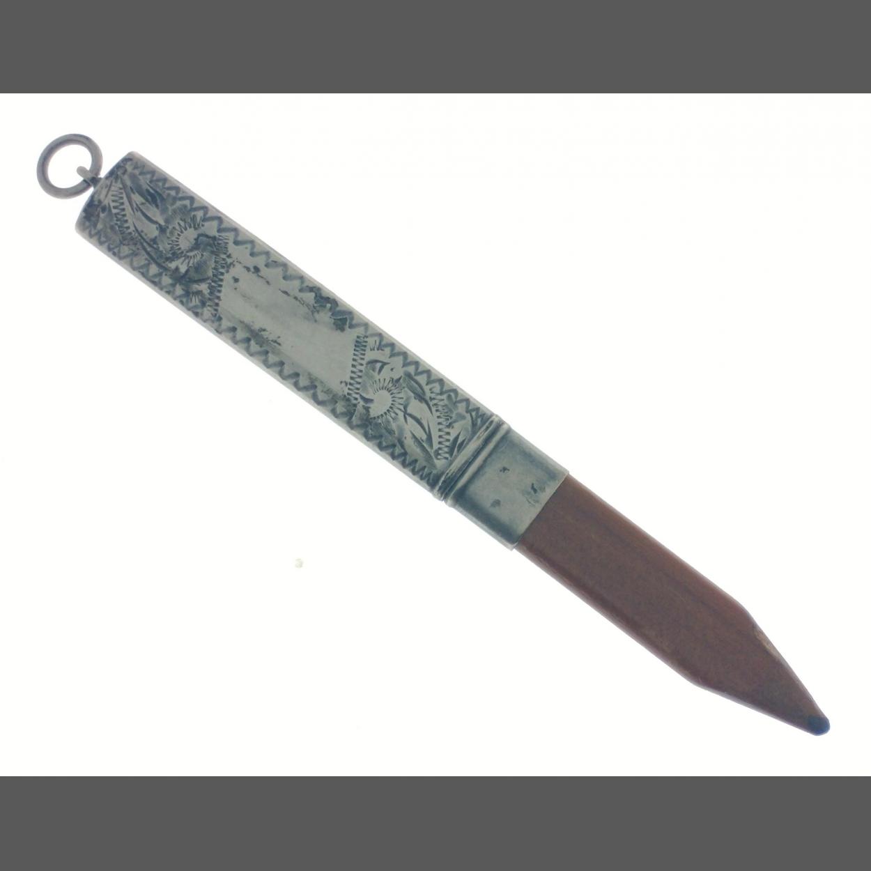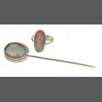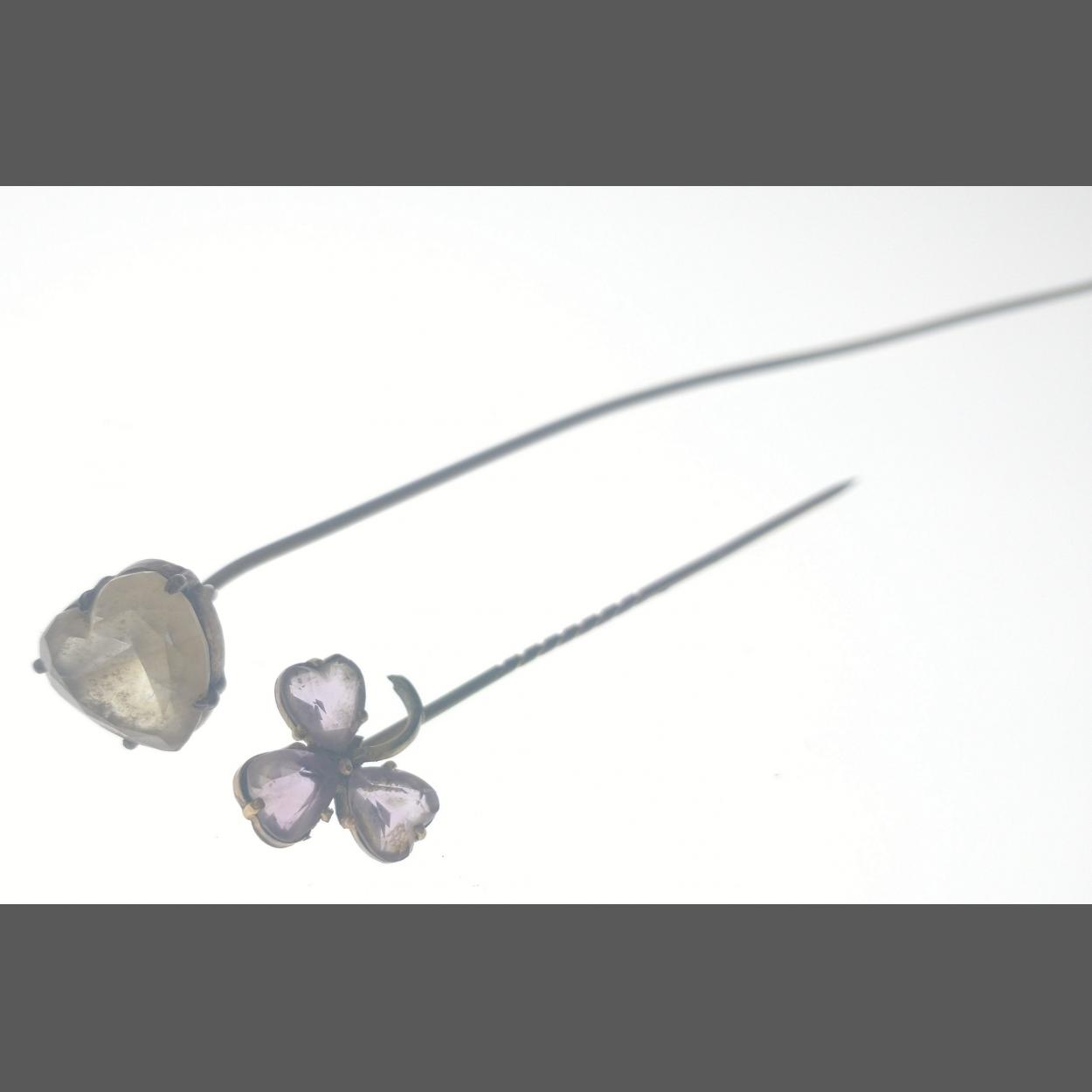 A VICTORIAN large 'yellow metal' hat pin with a heart shaped white stone inset 17.5cm long approx weight 3.50g approx, with also a small VINTAGE 'yellow metal' pin brooch in floral form with 3 small amethyst love heart shaped petals 7.5cm long approx weight gross 1.90g approx