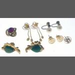 A TASTE OF THE ORIENT!! A 14K stamped yellow gold pair of earrings with green stones inset weight 2.40g gross approx, also a pair of unstamped 'yellow metal' Oriental design stud earrings in love heart form weight 1.45g, with an ORIENTAL part of an earring in 'yellow metal' weight .19g approx, and also another miniature pair of ORIENTAL 'yellow metal' stud earrings weight .66g approx and a part-pin missing brooch head with pinkish stone inset in 'yellow metal' weight gross 2.17g approx and lastly a pair of VINTAGE SILVER stamped pearl earrings gross weight 2.28g approx