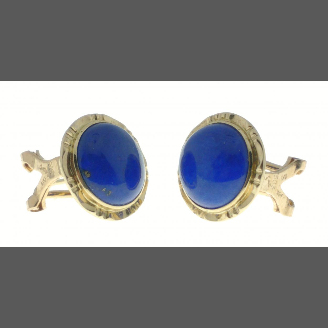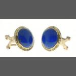 14k 585 stamped yellow gold pair of earrings with a large blue stone centred in each 4.1g gross weight approx(can be clip-on or stud!)