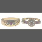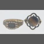 625 stamped 15 carat yellow gold dress ring with small garnets and seed pearls insetweight 2.02g ring size N, also a Birmingham Hallmarked 18 stamped yellow gold signet ring with a small garnet and flanked with two small diamonds(tested) ring size N weight 2.65g gross approx