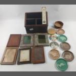 Wooden letter rack 18cm at tallest point, also some leather picture frames 8 x 12cm.