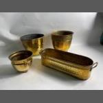 A nice collection of 4 brass planters two on tripod legs (16cm & 23cm dia), 1 oblong (40cm), one with embossed daffodil pattern (23cm dia)