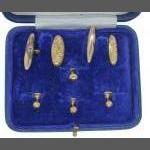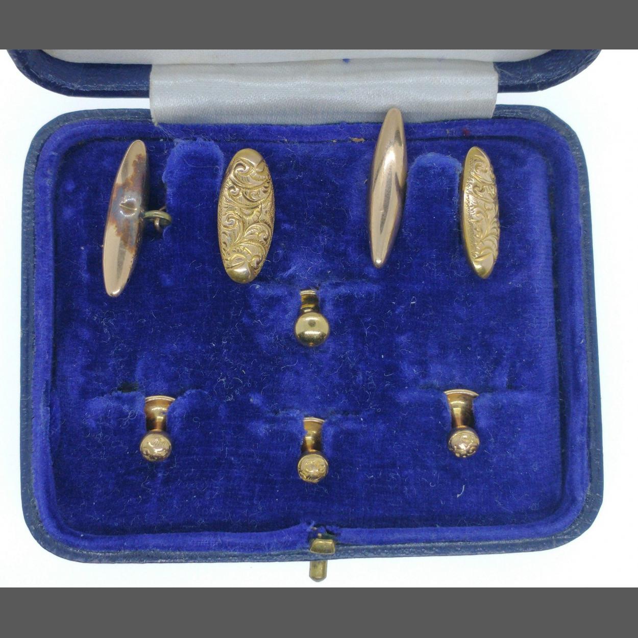 Presentation case with gold shirt studs and pair of cufflinks. 3 studs with engraved ends marked 9ct (1.5g approx), 1 plain design stud marked 18ct (approx 0.7g) and cufflinks marked 15 (4.9g approx)
