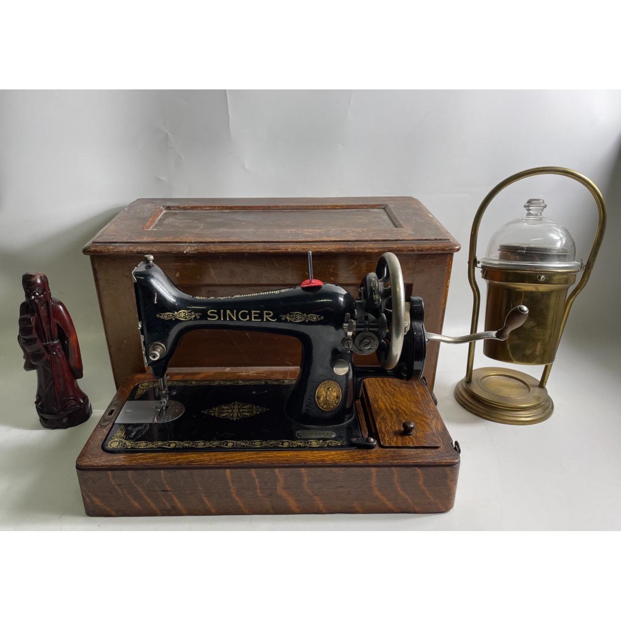 Vintage singer sewing hand crank machine and Brass glass domed swivel coffee pot (no burner) & carved wooden Chinese “Ancient” figure