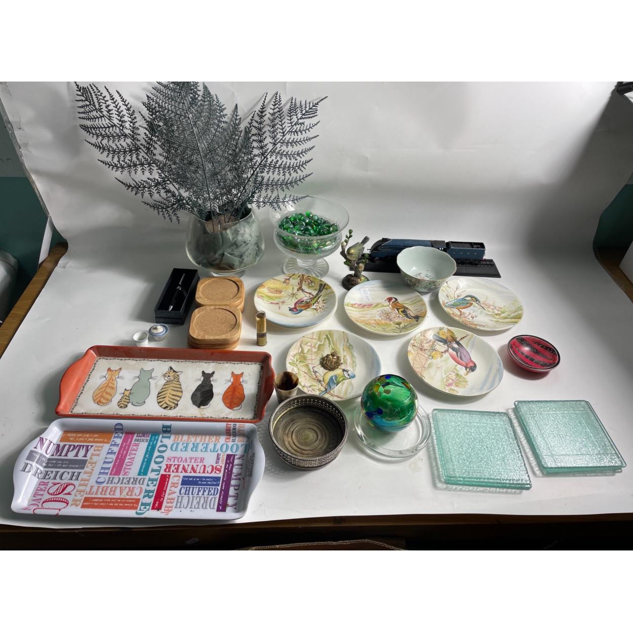 MIXED BOX to include decorative plates by SARREGUEMINES, French, plates as well as glass beads for flower arranging in an EDINBURGH CRYSTAL bowl, etc