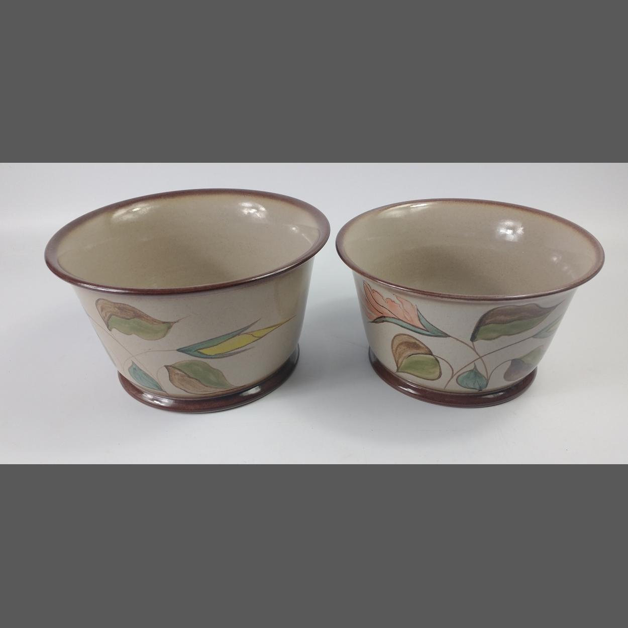 Two vintage DENBY plant pots one 19cm, the other 21cm diameter